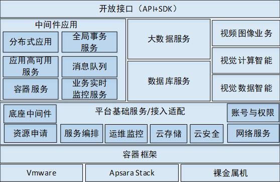 容器可以部署在裸金属机上、虚拟机上,同时也兼容飞天云。上层平台基础服务/接入适配层提供底座中间件、资源申请、服务编排、运维监控、账号与权限、云安全、云存储、网络服务等通用功能模块。上层是必备的关系数据库、时序时空数据库等各种数据库服务,以及大数据服务。视频图像业务、支持视觉计算智能、视觉数据智能的异构架构。分布式应用、应用高可用服务、容器服务、全局事务服务、消息队列、业务实时监控服务等中间件应用。最后云平台通过API或SDK对外提供开放接口。