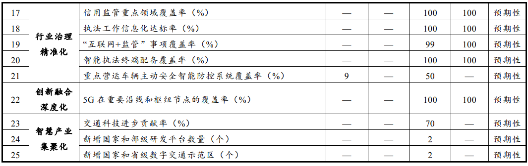 到2025年,智慧交通整体发展水平走在全国前列。初步形成数据平台一体化、基础设施数字化、运输服务全链化、行业治理精准化、创新融合深度化、智慧产业集聚化的良好格局。以5G、物联网、交通专网、数据中心为代表的信息化基础支撑平台底座建设取得显著成效。形成新型与传统交通基础设施融合发展格局,智慧交通基础设施建设规模和创新能级全国领先。综合运输全过程跨方式信息服务体系初步建成并试点推广。整合的省级信息系统全面建成、行业治理数字化转型升级广泛开展。实现5G、北斗等新技术在交通行业中的深度融合。形成若干在国内领先的智慧交通产业并实现产业集聚。