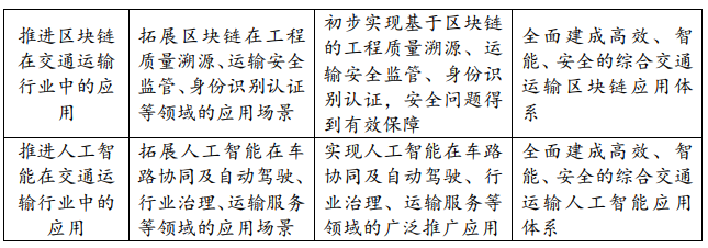 创新融合深度化。实现5G在重要沿线和枢纽节点连续覆盖,建成5G-V2X车路协同测试区和示范区,实现5G在生产服务和行业治理等领域的推广应用。初步建成高效、智能、安全的综合交通运输北斗应用体系。实现高分遥感在交通规划、工程监管等至少5个领域的推广应用。初步实现基于区块链的工程质量溯源、运输安全监管、身份识别认证等。实现人工智能在车路协同及自动驾驶、交通基础设施建养、行业治理等领域的广泛推广应用。