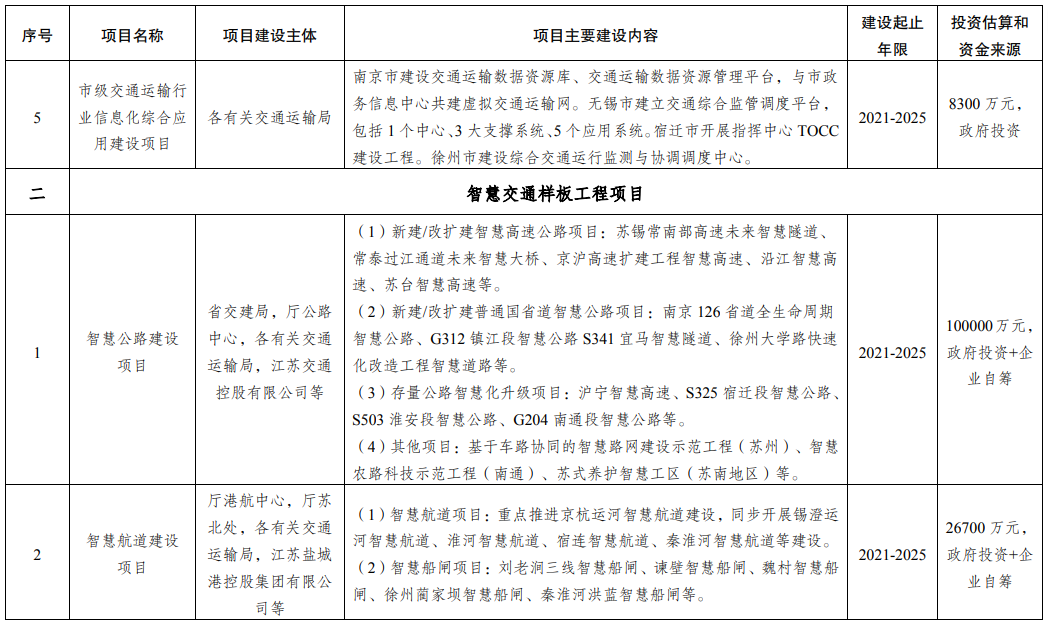 基础设施数字化。完成一批智慧公路、智能铁路、智慧航道、智慧民航、智慧港口和智慧综合枢纽等智慧交通基础设施建设。推动新建、改扩建高速公路和普通国省道公路同步开展智慧公路建设,实现“增量”提质升级,同时以沿江地区、苏南片区、南京都市圈等为重点,完成存量公路智慧化升级1200公里以上,实现“存量”挖潜增效,并在约200公里道路上实现车路协同。以推动京杭运河江苏段走在全国内河航运发展前列为重点,完成京杭运河江苏段全线智慧航道建设,存量航道智慧化升级达到700公里以上,并在重点航段实现有人干预下的船舶自主航行示范。